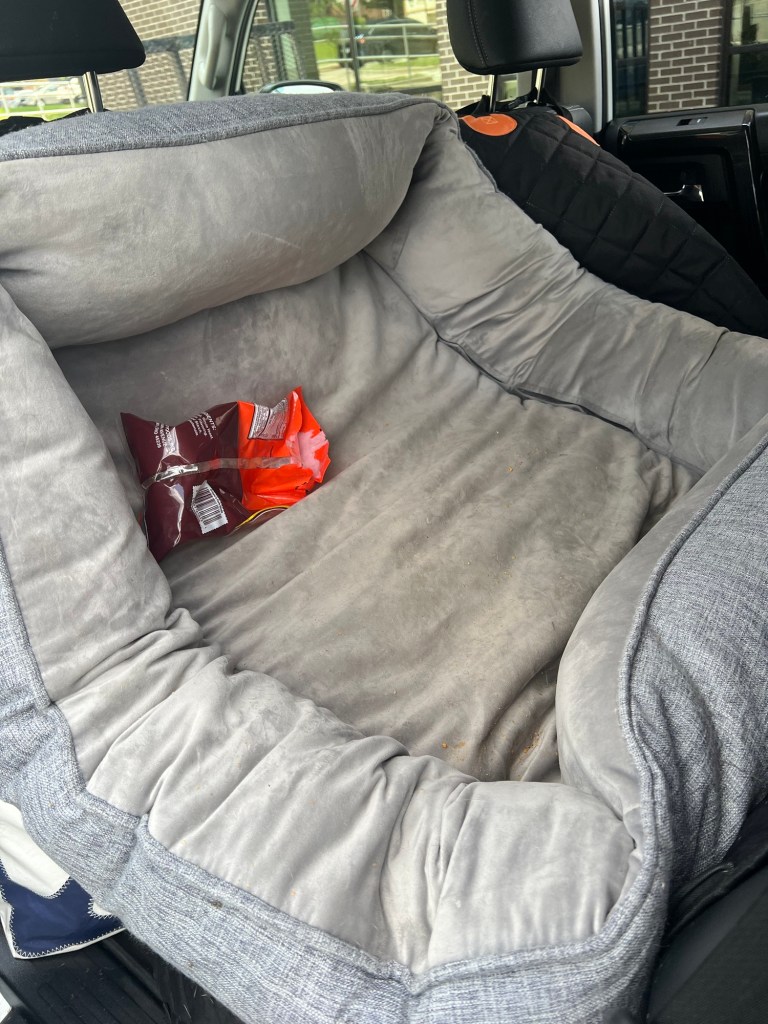 My humans did leave me in the car to go into the store to get some supplies. I panicked and thought they may not come back and I would starve so luckily I found a bag of pork rinds in the car. I didn’t share.